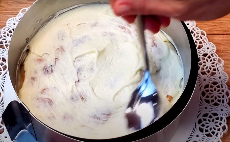 В кондитерское кольцо кладем корж, покрываем его слоем из крема.