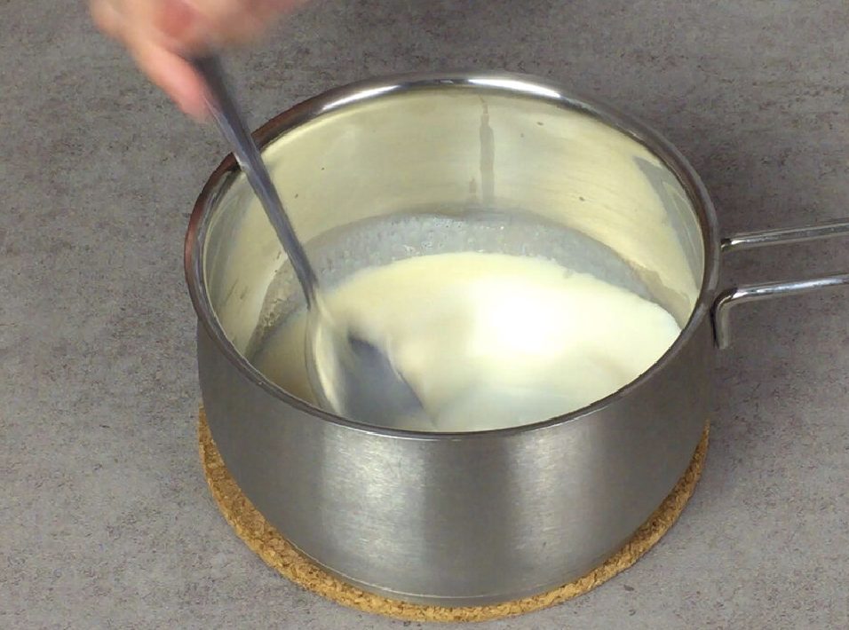В сотейник высыпаем желатин, добавляем молоко и перемешиваем. И растворяем желатин на маленьком огне, слегка прогреваем, чтобы желатин лучше растворился. Снимаем с огня и добавляем еще 50 мл молока, перемешиваем.