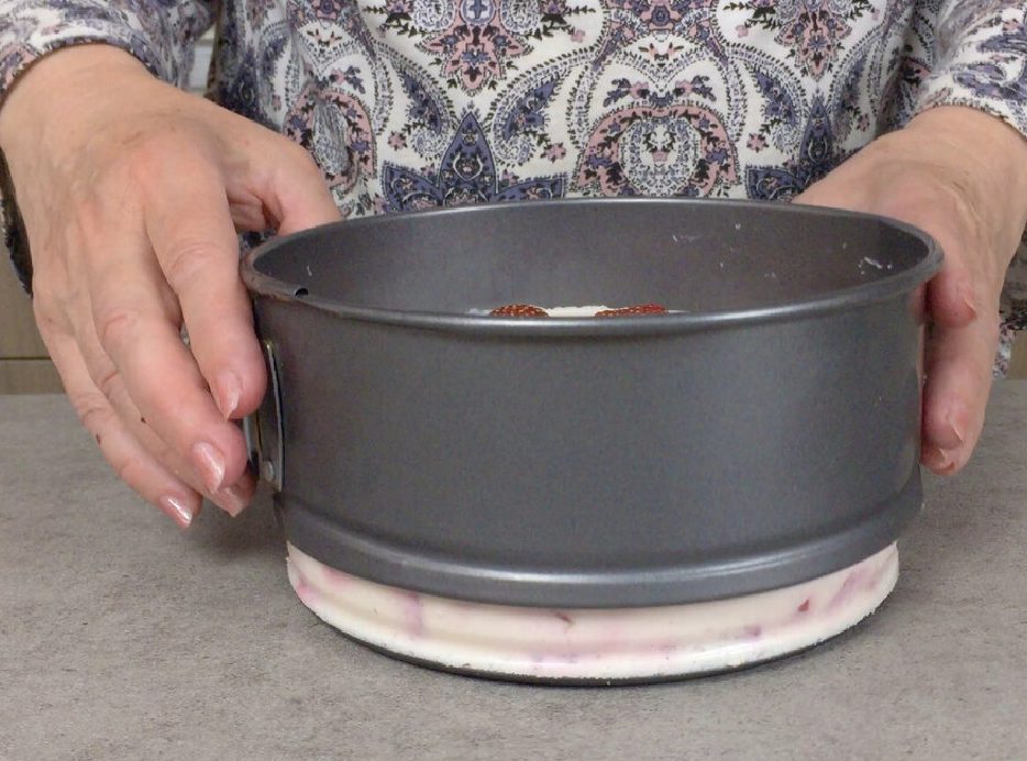 Торт у меня простоял ночь в холодильнике и теперь снимаем пищевую пленку. Аккуратно тонким ножом проходимся по бокам формы, чтобы отсоединить его от формы. Вынимаем торт из формы.