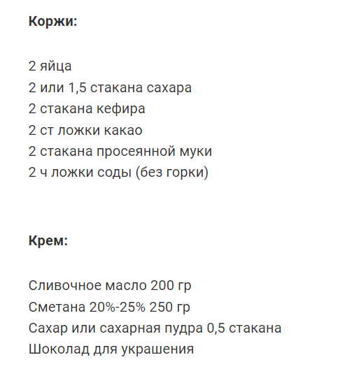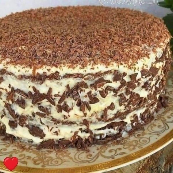 Крем делят на три части и прослаивают коржи. Остатками смазывают поверхность и густо обсыпают ее шоколадной крошкой для красоты. Можно заменить крошку на кокосовую стружку либо на вафельную крошку.