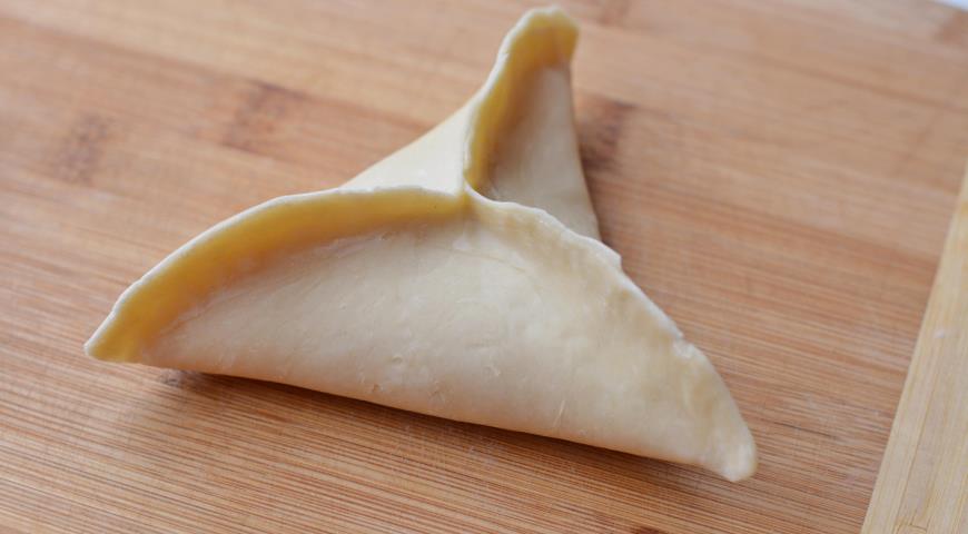 Сформировать треугольный пирожок. Переложить на противень, застеленный бумагой для выпечки швом вниз.