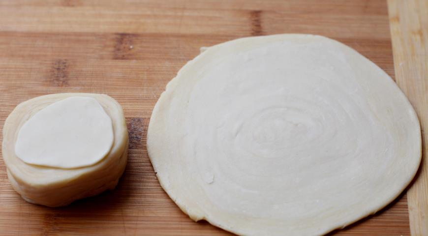 Разрезать с середины острым ножом кусочки, толщиной 1,5 см. Положить на 15-20 мин. в морозильную камеру, чтобы масло застыло. Далее на срез кладем кусочек отдельно раскатанного теста, он будет слеплять слои между собой, чтобы они не расползлись, и раскатывать лепешечку. Кусочки станут твердыми за счет масла и их будет очень удобно раскатывать без муки или крахмала.