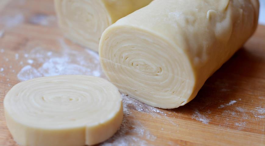 Размягченным сливочным маслом смазать каждый пласт теста. Прежде чем укладывать сверху пласт теста, дать маслу с нижнего пласта застыть!Как масло застыло, начинаем скручивать плотный рулет.