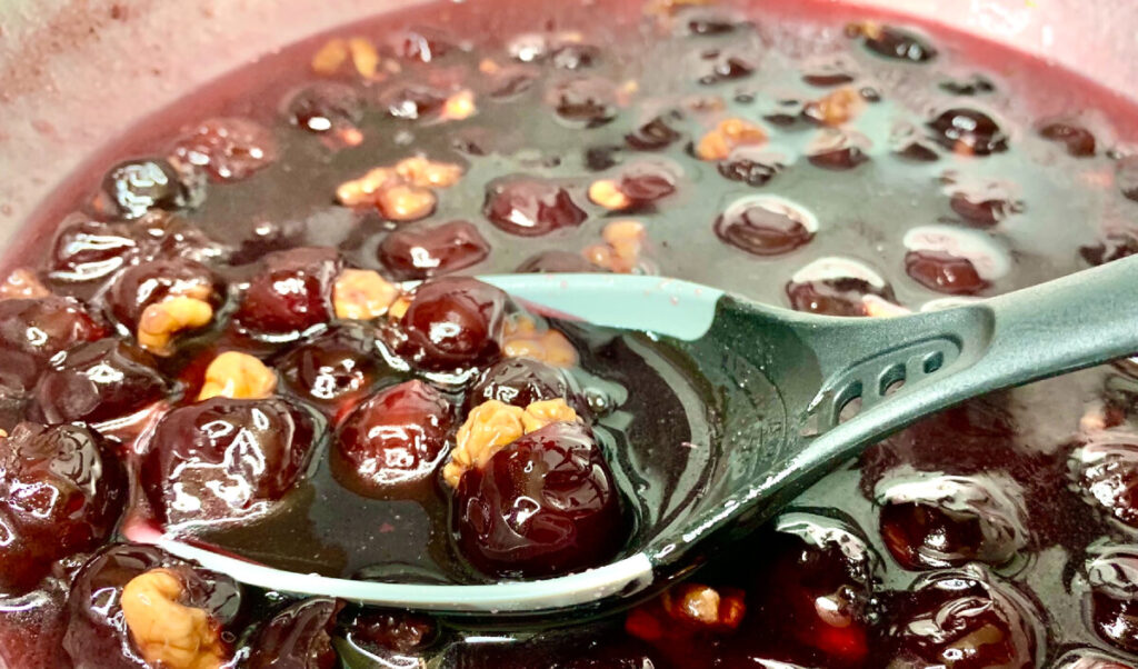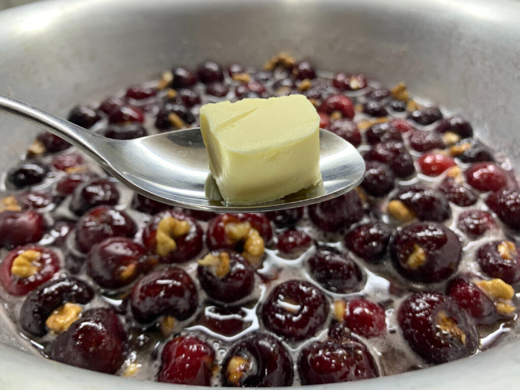 Сразу отвечу на ваши вопросы: никакого вкуса, никакого запаха от маленького кусочка масла не будет! На цвет сиропа масло так же не влияет. Что касается жирной пленки, в черешневом варенье с орехами она у меня была, но в мизерном количестве! А когда варенье остыло полностью, то и пленка исчезла.