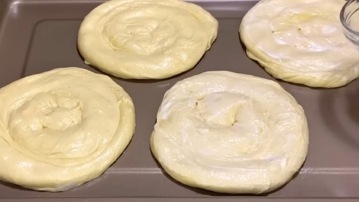 Ещё через 5-10 минут переложите улитки на противень с пергаментной бумагой. Пальцами немного расплющьте. Сверху смажьте йогуртом.