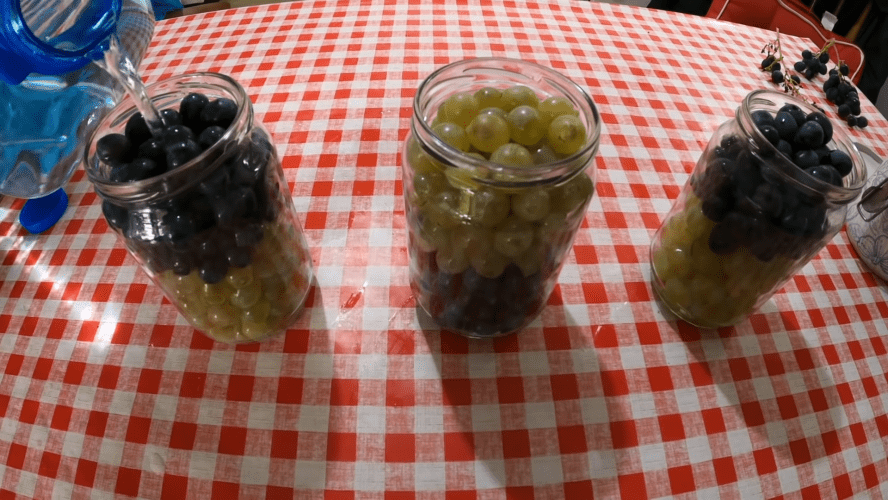Наполняем банки до верху. И заливаем обычной водой, в идеале родниковой. По желанию для наполнения используем виноград нескольких сортов.