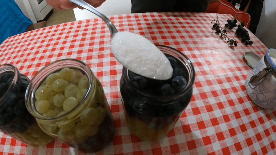 В каждую банку кладем по 1 столовой ложке сахара, а затем закручиваем крышки. Добавление сахара обязательно, даже если виноград сладкий. Сахар в данном случае используется в качестве консерванта. Добавлять его можно и на дно банки перед закладкой ягод.