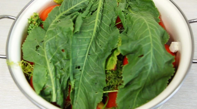 Выливаем приготовленный рассол в кастрюлю с помидорами, накрываем листьями хрена.