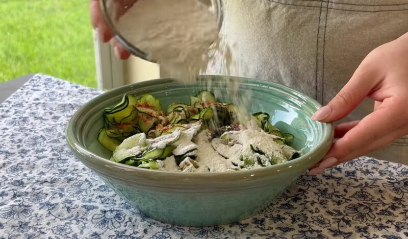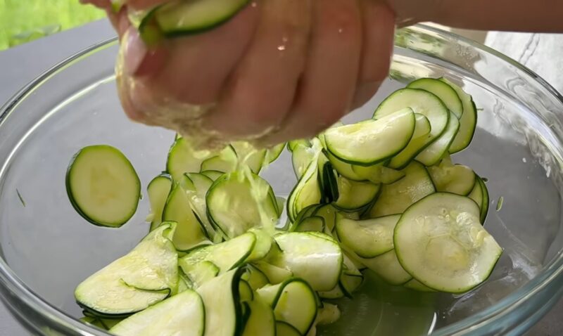 Очень тонко нарежьте кабачки. Для этого удобнее всего использовать специальную терку. Добавьте к кабачкам чайную ложку соли, хорошо перемешайте и оставьте на 15 минут, чтобы кабачки пустили сок. Хорошо отожмите кабачки: необходимо убрать всю лишнюю воду.
