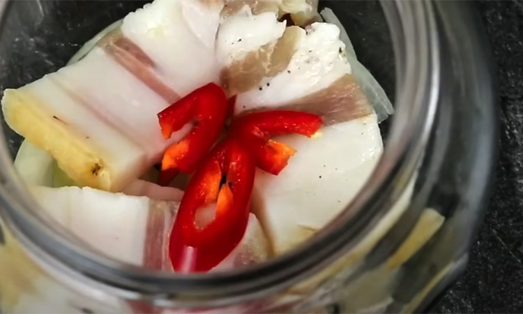 Тонко нарежьте сало и выложите его в банку на слой лука, перца и чеснока.
