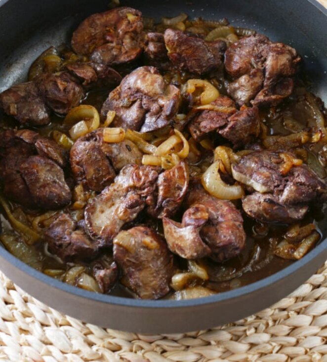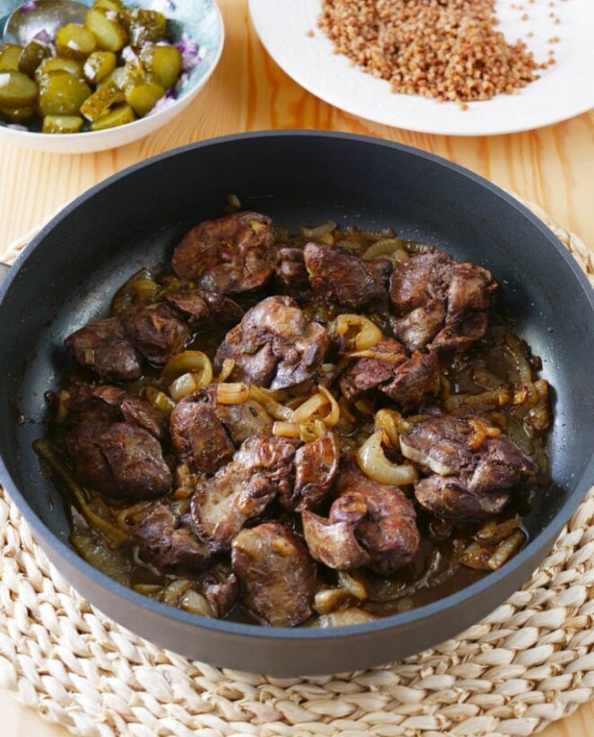 И главное: про сковородку. Есть хитрость: перед приготовлением обдать печенку кипятком — или погрузить в кипяток на пару секунд.