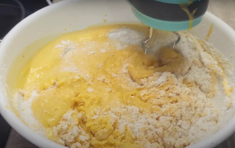 Делаем углубление в сыпучих продуктах и вливаем туда смесь из желтков и опары, смешиваем. Добавляем в тесто сливочное масло, взбиваем миксером до однородности.