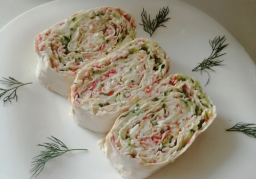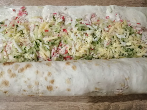 Положите второй лаваш и в той же последовательности выложите оставшиеся продукты. Скрутите лаваш в плотный рулет. Делайте это аккуратно.