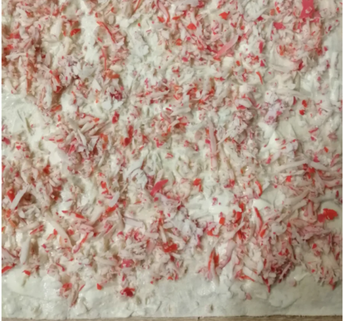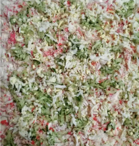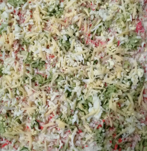 Разложите сверху крабовых палочек. Яйца тоже натрите и выложите следующим слоем.