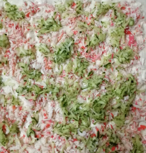 Разложите их на лаваше равномерным слоем. Крупно натрите огурцы и отожмите от жидкости. Можете их присолить, оставить ненадолго, а после отжать.