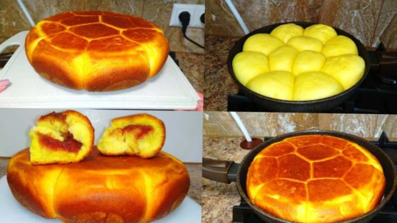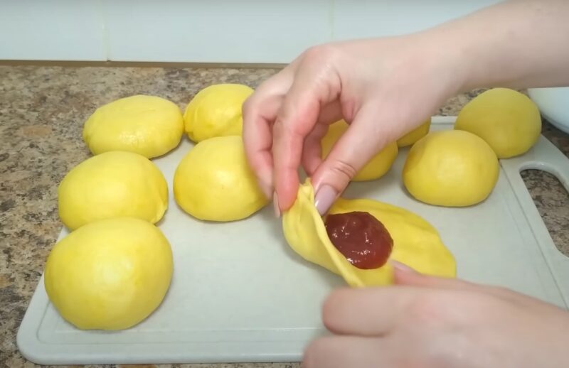 Делим тесто на 11 колобков, которые раскатываем в лепешки. В каждую лепешку кладем по столовой ложке повидла, запечатываем начинку внутри.