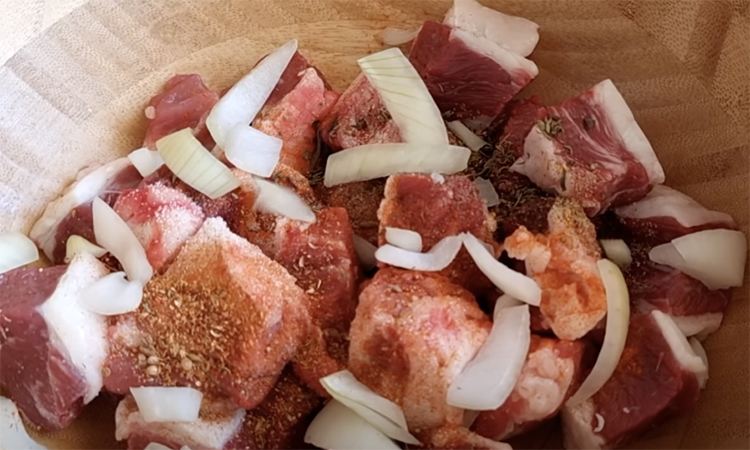 Мясо режем крупными кусками в глубокую миску. Добавляем специи и соль, все тщательно перемешиваем с мелко нарезанным луком. Дайте мясу немного промариноваться.