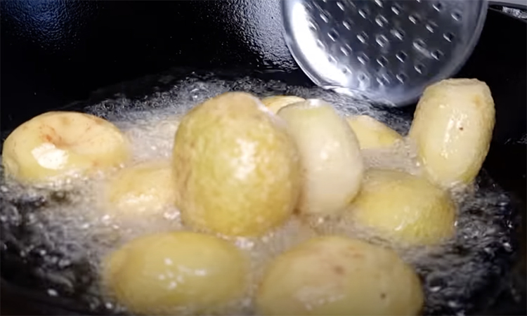Теперь разогреваем в казане растительное масло как для фритюра. Обжариваем очищенную небольшую картошку целиком.