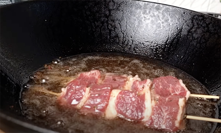 Нанизываем мясо на шпажки и также обжариваем его в масле.
