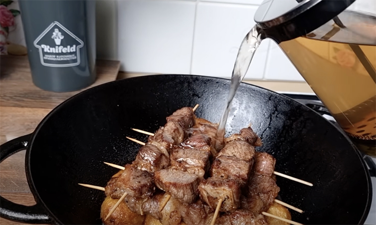 Ингредиенты: 500 граммов любого мяса, чайная ложка соли, 1/4 чайной ложки перца, лук, 1/2 чайной ложки базилика, столько же приправы для шашлыка, немного растительного масла, 800 граммов картошки, 400 миллилитров зеленого чая.