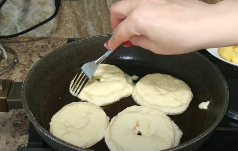 Обжариваем яблоки в тесте с каждой стороны до золотистой корочки.