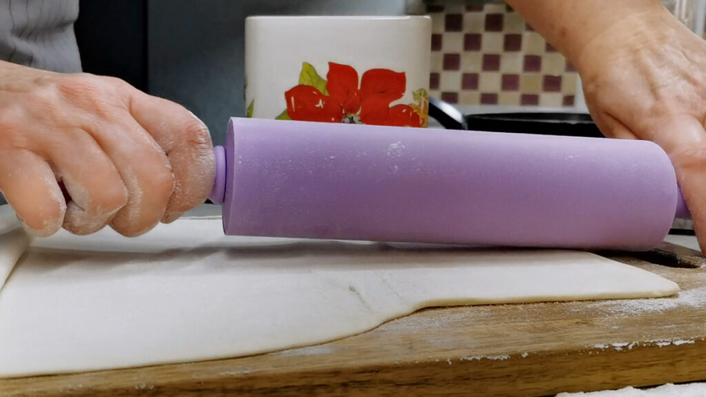 Итак, берем слоеное бездрожжевое тесто, размораживаем его заранее при комнатной температуре. Присыпаем стол и сам квадратик теста мукой и раскатываем до размеров примерно 30х40 см. Раскатывать можно во всех направлениях, тоже кто бы что не говорил.