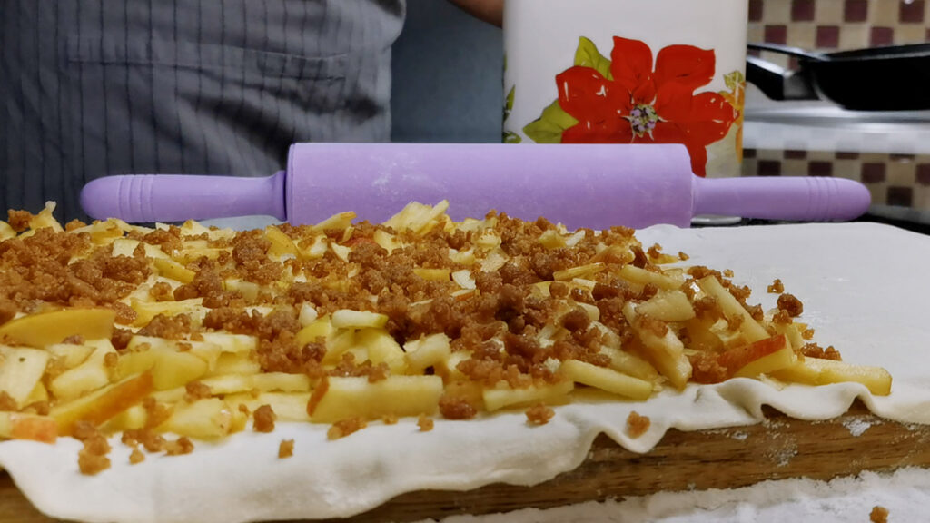 Далее сворачиваем всё это в рулетик, аккуратно, чтобы не порвать тесто. Но даже если оно кое-где продырявится яблоками, это нестрашно. В штруделе несколько слоев и еще есть та треть свободного края, которая прикроет всё снаружи.