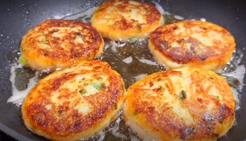 В сковороде разогреваем растительное масло, выкладываем котлеты из теста. Обжариваем пирожки до золотистой корочки на среднем огне с обеих сторон.