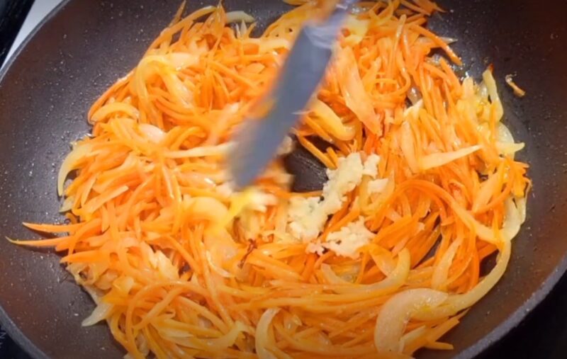 Обжариваем лук с растительным маслом в сковороде до мягкости. Добавляем к луку морковь, продолжаем обжаривать.