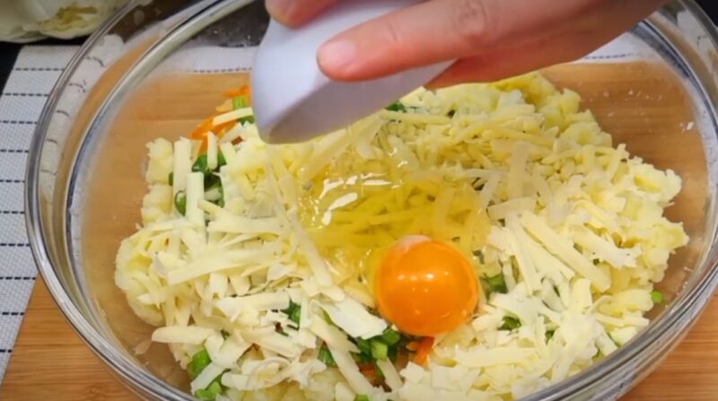Не забываем посолить картофельную смесь, разбить в нее яйцо, высыпать муку и тщательно перемешать.