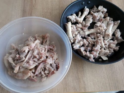 На снимке в черной сковородке лежат все косточки от трех ножек, а слева то, что я сняла с костей. После это мясо я смешала с остальным мясом и крепко скрепила его.