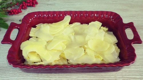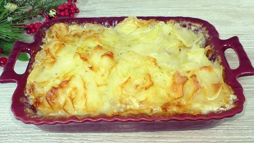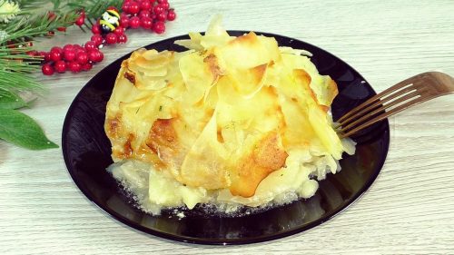 В итоге верхний слой картофеля образует аппетитную румяную корочку, а нижний слой полностью пропекается, а лук практически растворяется, придавая блюду насыщенный вкус.