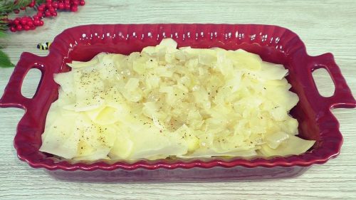 Следующий слой — снова лук и картофель, которые также солим и перчим.