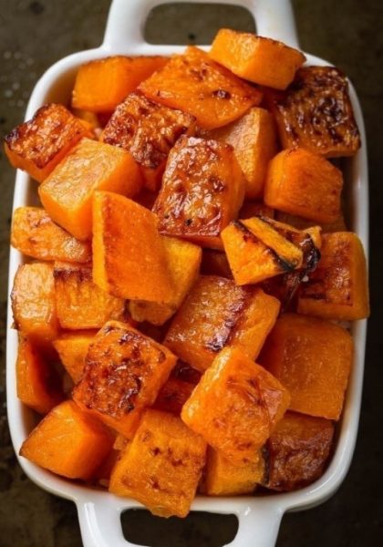 Печется тыква относительно долго, минут 35. В середине процесса хорошо бы перемешать эти кубики. К концу из духовки будет пахнуть так, что захочется вытащить лист пораньше, но вы держитесь, дело того стоит. Получается удивительно вкусный и ароматный десерт, вы не пожалеете, что сделали.