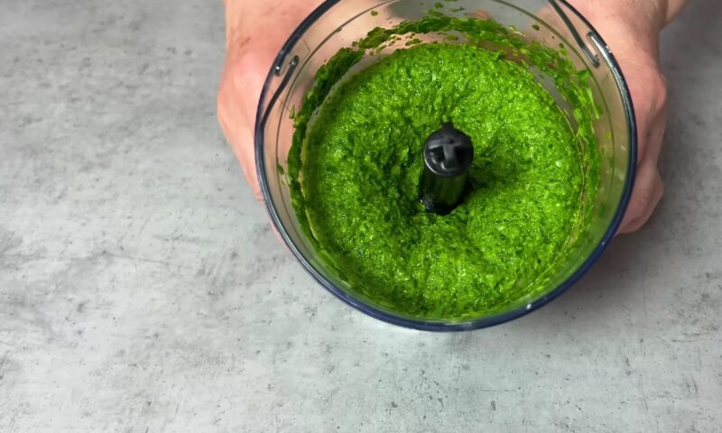 Измельчите зеленый лук, молодую зелень чеснока и петрушку. При желании можно добавить зелень укропа и сельдерей, которые сделают вкус зеленого соуса еще более насыщенным. Нарезанную зелень измельчите в чаше блендера.