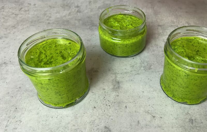 Готовый зеленый соус переложите в баночки. Чтобы увеличить срок хранения соуса, сверху налейте небольшое количество растительного масла.