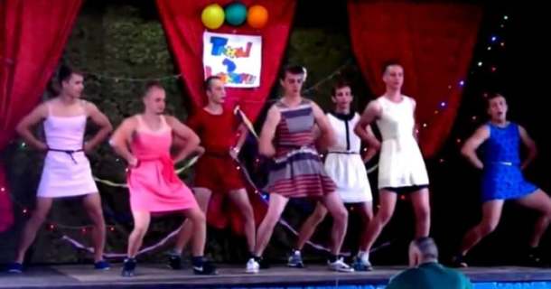 Они подготовили к школьному концерту танец. Да такой, что просто взорвали зал. Они переоделись в платья и танцевали под песню «Танцуй, пока молодая, девочка Рая!». Только посмотрите на парня в синем платье! Ему явно нравится то, что они делают.