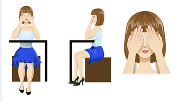 Сядьте прямо, расслабьтесь. Прикройте глаза таким образом: середина ладони правой руки должна находиться напротив правого глаза, то же самое с левой рукой. Ладони должны лежать мягко, не нужно с силой прижимать их к лицу. Пальцы рук могут перекрещиваться на лбу, могут располагаться рядом — как вам удобнее. Главное, чтобы не было «щелочек», пропускающих свет. Когда вы в этом удостоверились, опустите веки. В результате получается, что ваши глаза закрыты и, кроме того, прикрыты ладонями рук.