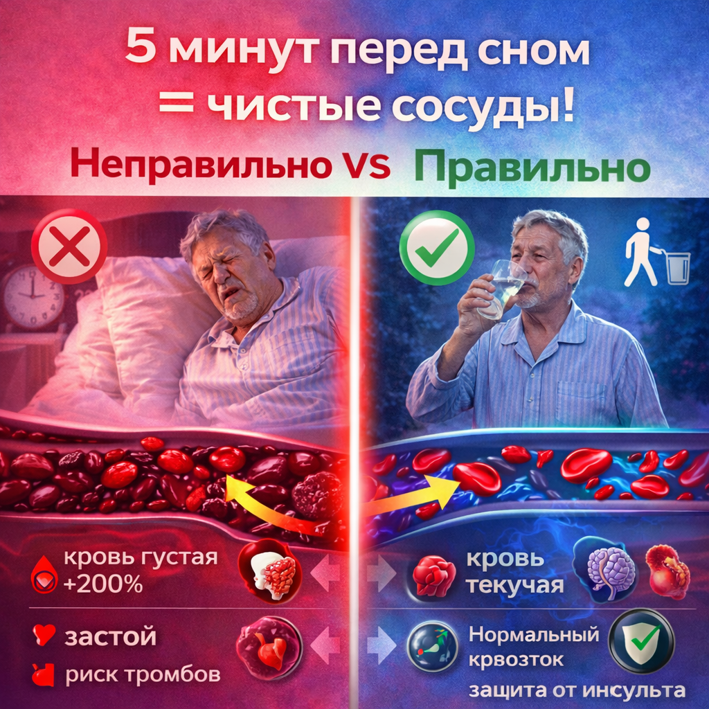 Ночью кровоток медленный. Если сосуды не подготовлены — кровь застаивается, густеет, образуются тромбы.