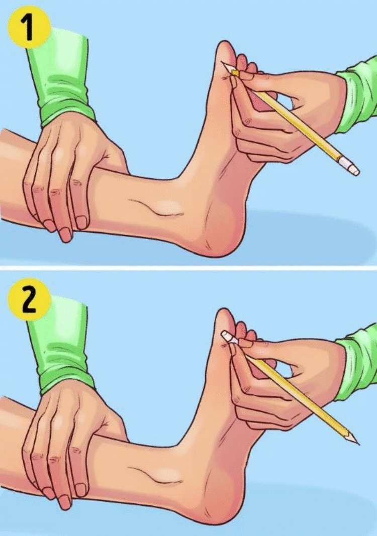 Для этого теста возьмите помощника. Пусть он возьмет карандаш с ластиком на одном конце и пока вы держите глаза закрытыми, касается переменно его острием и мягкой частью ваших босых ног — пальцев и ступней. Отсутствие хорошей чувствительности может быть признаком невропатии — патологии нервных окончаний ног из-за диабета.