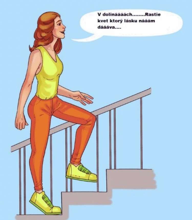 Для проведения этого теста вам нужно оказаться на лестнице и до него не испытывать интенсивных нагрузок — состояние должно быть обычное и спокойное. В обычном темпе преодолейте 10-12 ступеней, но — не молча, при этом человек должен петь либо быстро и энергично разговаривать сам с собой.