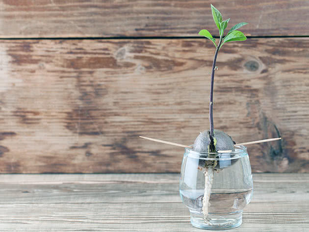 Можно прорастить авокадо и без использования грунта. В косточке проделывают две маленьких дырочки и вставляют в них зубочистки, после чего косточку опускают в воду тупым концом на половину длины. Все время, пока косточка не даст ростки, нужно подливать в стакан воду до необходимого уровня, а иногда заменять ее свежей. Через время косточка начнет подсыхать и трескаться, и вскоре из нее появится росток. Можно заменить воду гидрогелем.