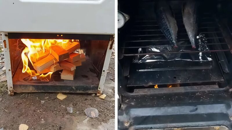 Создание уличной печи: Очистите духовку и уложите внутрь дрова. Разожгите огонь, затем закройте дверцу, чтобы тепло долго сохранялось и создавался эффект камина.