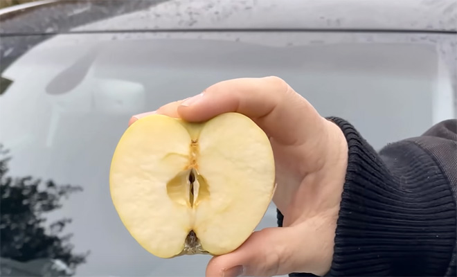 Водители грузовиков используют этот метод очень давно. Трюк не требует больше никакой подготовки: буквально нужно просто разрезать яблоко пополам и натереть им лобовое стекло.