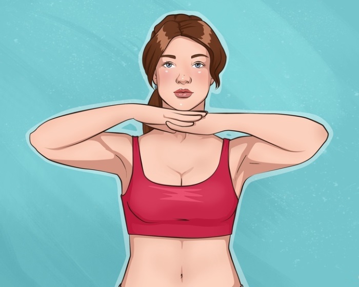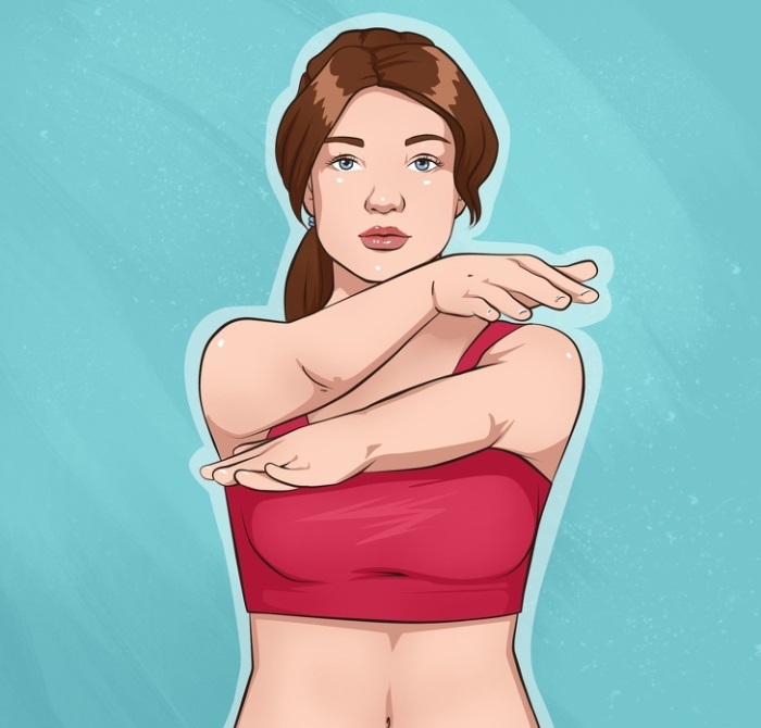 - Встаньте прямо и скрестите руки перед грyдью, поместив ладони на локти.