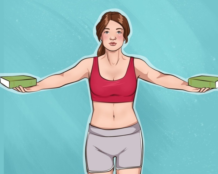 - Возьмите в руки по толстой книге / гантели.