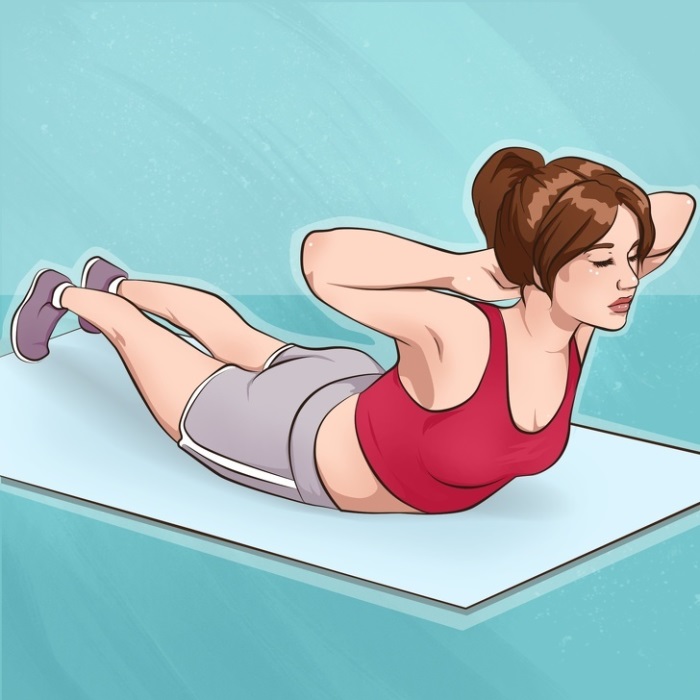 - Оторвите грудь от пола и поднимите голову.