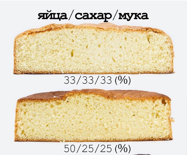 Также, не последнюю роль играет, правильное соотношение сахара, муки и яиц (25-25-50). Например, если Вы берете пять яиц, то сахара и муки должно быть по 125 грамм. Чем больше яиц, тем нежнее получится тесто.