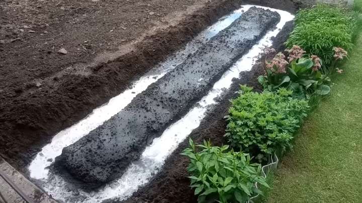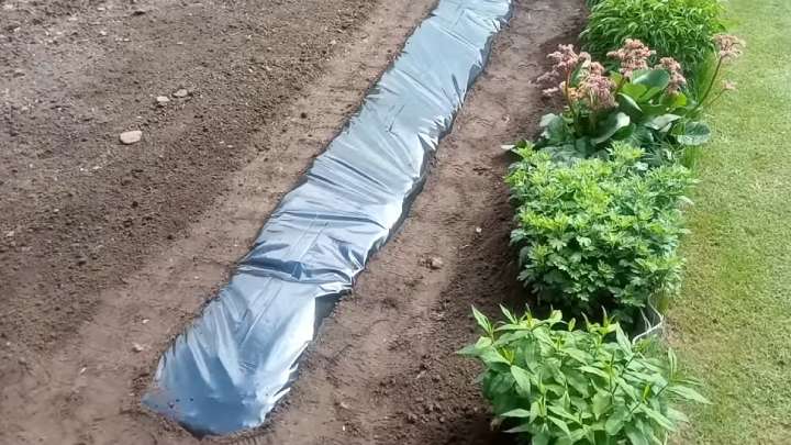Положите чёрную, плотную плёнку поверх грядки, прикопайте траншею землей, чтобы плёнка по бокам грядки была под грунтом. Оставьте грядку в таком виде на 3 дня, чтобы она прогрелась и начал образовываться конденсат — именно он и будет питать огурчики.