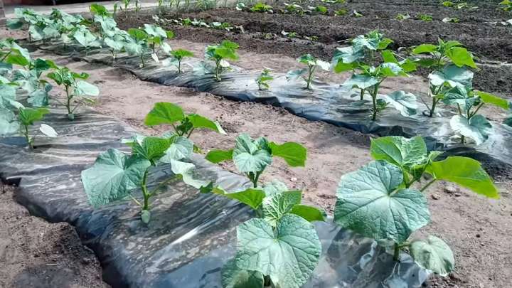 Сделайте в плёнке надрезы в шахматном порядке на расстоянии около 20 см, высадите рассаду или семена огурцов. Больше ничего делать не нужно!